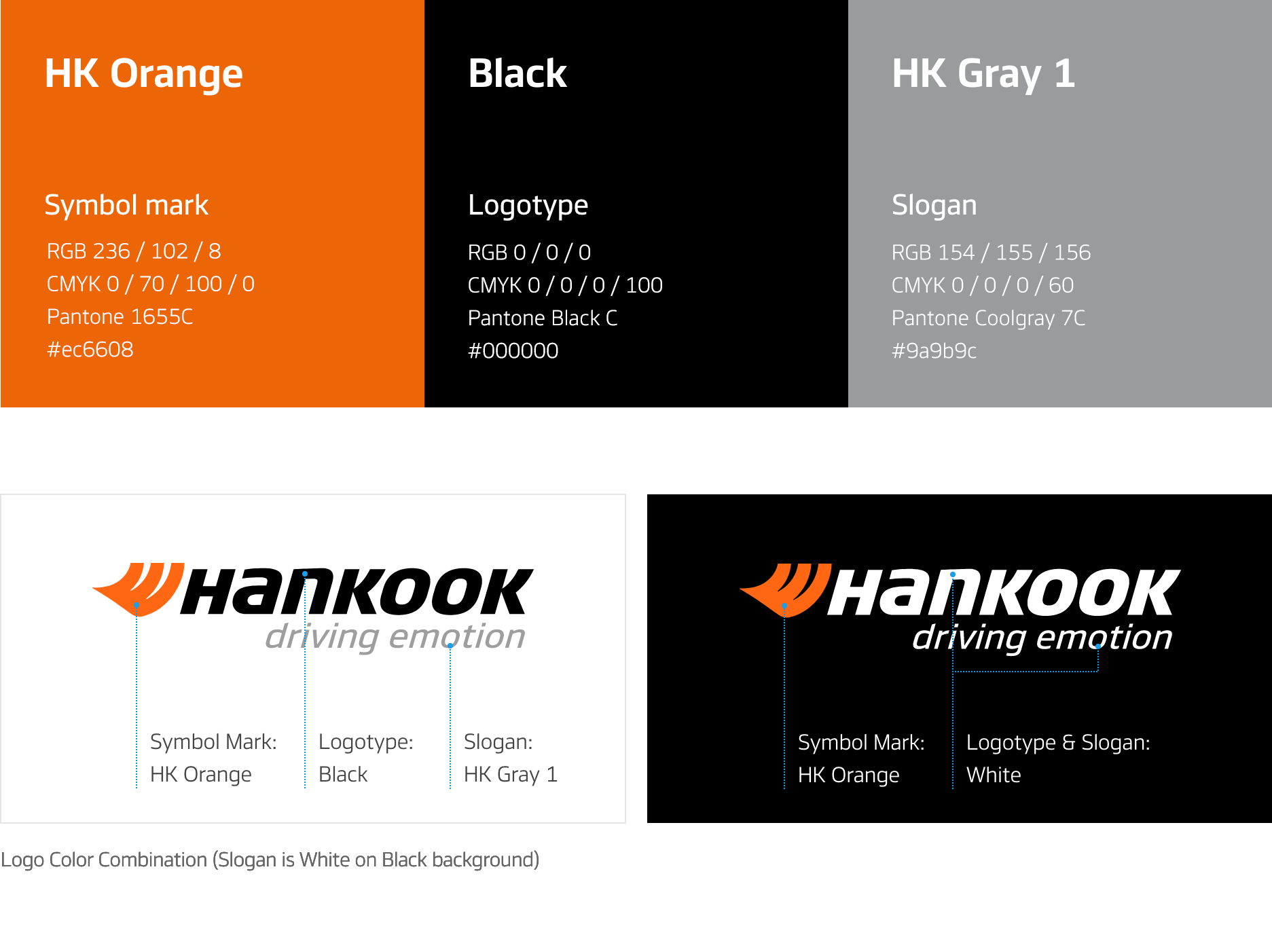 The colors of Hankook Tire & Technology are orange and black.* When printing, spot colors should be set by default, but if the spot colors are not available, the CMYK colors of Process Color may be used as alternatives.