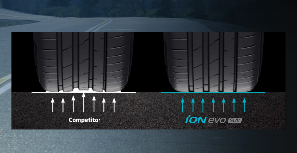 Battery weight makes electric vehicles up to 30% heavier than ICE vehicles, which frequently causes uneven wear on tires. The iON evo SUV is made of ProDurable Compound specifically made for electric vehicles to extend tire life in a healthier condition. iON evo SUV through Round Even Technology evenly spreads out road pressure by optimizing contact structure and provides the overall lifespan with uniform tread wear.