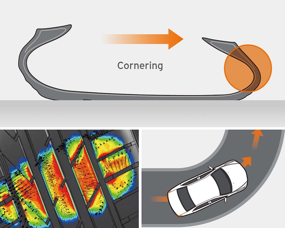 Even loads transfer vertically and laterally, they maintain a stable foot shape through an optimal design based on multiple tread radius profile & equilibrium carcass line. Providing the best handling performance.
